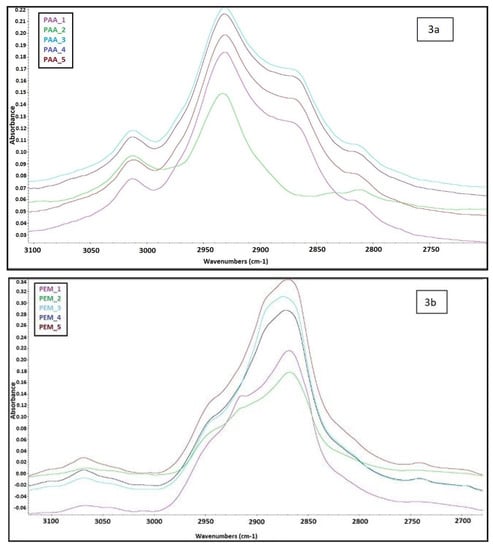 In Figure 3, the characteristic N-H stretching vibrations of amino groups having a broad absorption peak at 3000 cm−1 that are found in poly(amic acids) after thermal imidization was not observed in the polyimides. The clear absorption peak at around 2882 cm−1 seen in Figure 3b in PEMs is due to C-H stretching of PEG, where before imidization, this aliphatic C_H stretching was also observed at around 2940 cm−1 for PAAs.