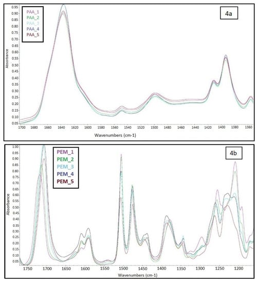 FTIR spectra with their corresponding intensity data of the PAA precursors and PEMs are given in Supplementary Figures S1–S6, respectively. For discussion purposes, intensity data changes are shown, with emphasis given to certain areas where the success of imidization can be identified, in Figure 3 and Figure 4.