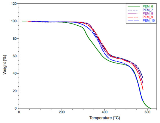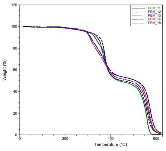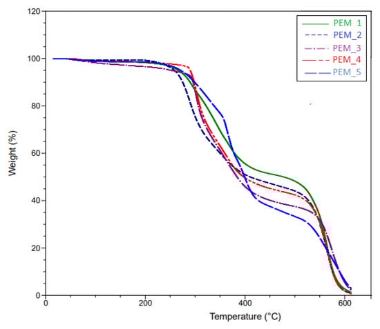 Thermal gravimetric analysis (TGA) curves of PEM_1–PEM_5.