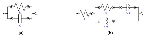 Electrochemical impedance (EI) is the response of an electrochemical system (cell) to an externally applied potential. We used the Autolab potentiostat/galvanostat PGSTAT204 instrument combined with the FRA32M electrochemical impedance spectroscopy (EIS) module to measure the potentiostatic impedance of the cell containing the membranes of Table 1 as electrolyte over a wide frequency range of 0.1 Hz to 2 MHz, with 10 points per decade. The amplitude of externally applied alternating current (AC) voltage was set to be 0.01 V and the current range of 100 nA to 1A was selected for the frequency scan. The measured real and imaginary parts of the complex impedances of the systems were then represented by Nyquist plots. These Nyquist plots were also modeled by using the calculated EIS response of an equivalent circuit for further validation. In search of proper equivalent circuits for systems where doped membranes were used as an electrolyte, the best fit was found by replacing the Faradaic impedance of a double layer, i.e., the interface between the electrode and the neutral bulk electrolyte, by the appropriate constant phase element that takes into account the deviation of the double-layer capacity from ideal behavior. The intersection of the Nyquist curve with the real axis at the high frequency is used to calculate the proton conductivity of the membrane electrolyte for doped membranes. Then, after evaluating the resistivity for all cases, where the resistivity is obtained from the measured Nyquist plot and compared with the corresponding fit value of the equivalent electrical circuit, Equation (1) was used to calculate the conductivities []: