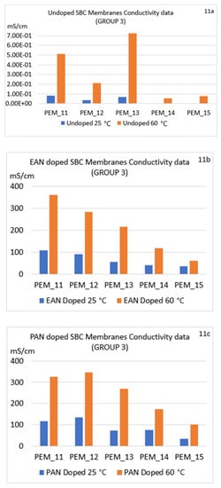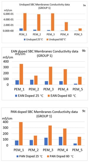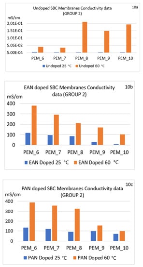 When looking at PEM_1 to PEM_5, IL-doped membranes at two temperatures, it is observed that the IL uptake and WU uptake values increase with increasing temperature. These results are again in line with the findings of Woo et al. [], where it was noted that heating caused structural change towards more well-defined phase separation where the EAN-PEG domains had wider and more distinctive SAXS peaks. Thus, we conclude that the EAN-PEG phase separation becomes dominant as the temperature increases, thus permitting more IL to be incorporated into the system. However, it should be noted that the IL uptake, especially at the elevated temperature, showed higher deviations for ionic liquid doping. These findings may reflect structural changes at the nanometer level in favor of creating a more mobile environment. In particular, the higher mobility might lead to the formation of more well-defined free volume microchannels. However, further investigation is needed.
