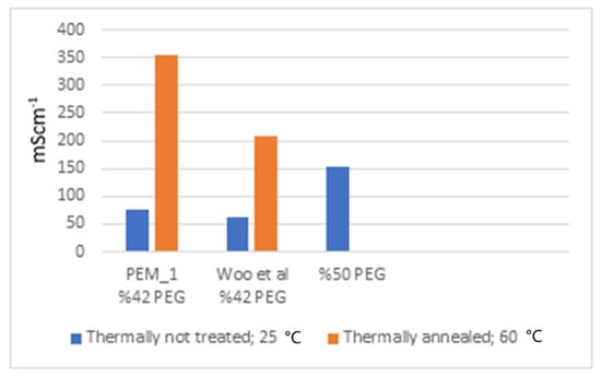 Recent studies showed that segmented block copolymer (SBC) membranes derived from PI and PEG doped with ionic liquid ethylammonium nitrate (EAN) increased the conductivity by two to five times upon thermal annealing at around 100–140 °C []. It was shown that the ionic liquid also acted as a plasticizing agent, which enhanced polymer chain mobility, thus improving the membrane ionic transport capability by decreasing the intermolecular forces among polymer chains [].