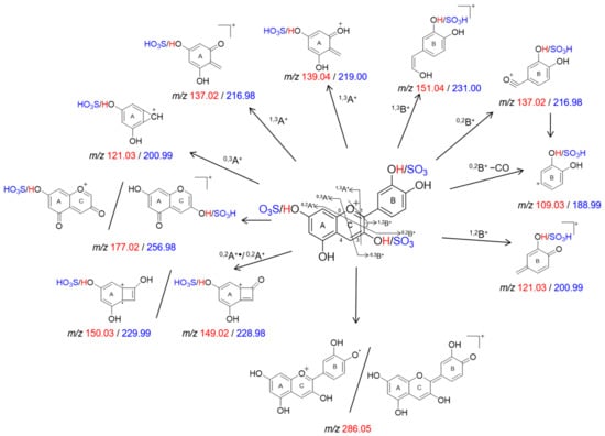 Postulated ESI+ fragmentation scheme for cyanidin (red) and its derivatives (blue) sulfated on the A, B or C ring, based on the proposals of Barnes and Schug [], González-Manzano et al. [], and Oliveira et al. []. Conjugation positions are arbitrarily selected and may occur at any OH group.