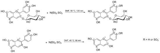 Chemical hemisynthesis may be a more suitable tool to generate sulfated metabolites of anthocyanins. However, the sensitivity of anthocyanins to light, pH changes, and high temperature poses a problem [], as does the lability of the sulfate groups under acidic conditions and at high temperatures []. As a result of these stability issues, synthesis should be carried out with as few steps as possible and under mild conditions. In anthocyanins, two types of hydroxyl groups are present, which are the aromatic OH groups of the anthocyanidin aglycone and the aliphatic OH groups of the sugar moiety. Because to our knowledge, there is no report about sulfations in the human body taking place on the sugar hydroxyl groups of anthocyanins, we aimed at the chemical hemisynthesis of anthocyanins sulfated on the flavonoid moiety. For this purpose, we used cyanidin-3-O-glucoside obtained from blackberry juice and the cyanidin aglycone prepared according to a previously described protocol []. Subsequently, we conducted a pilot study with two participants, who consumed blackberry juice and provided urine samples for analysis by LC-MS. This, in turn, was compared to the synthesized reference substances. Among other phase II metabolites of cyanidin, sulfated cyanidin-3-O-glucoside and sulfated cyanidin were detected. The aim of this work was to generate authentic reference substances for the identification of sulfated metabolites in real human biological samples.