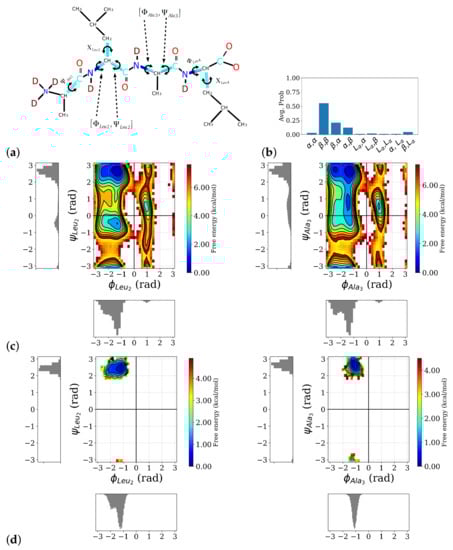 We performed classical MD simulations of the Ala-Leu-Ala-Leu (ALAL) peptide in a cubic simulation box of explicit water (1477 molecules modeled as TIP3P [36] water) employing the AMBER 99SB-ILDN [37,38] force field. We used a minimum distance of 1 nm between the solute and the box’s periodic boundaries, resulting in side length of 3.61 nm and a total number of atoms of 4492. Water hydrogen atoms and polar hydrogen atoms of the peptide () were modeled with deuterium mass. For Lennard-Jones interactions and electrostatic interactions (Particle-Mesh Ewald [39,40] with a grid spacing of an interpolation order of 4), we used a cutoff value of 1 nm. The system was minimized and equilibrated for 500 ps. We ran six μs-long MD simulations, which result in a total simulation time of μs. A V-rescale [41] thermostat was applied to control the temperature at 300 K (NVT ensemble). The positions of the solute atoms were saved to file every ps. No constraints were applied, and the leap-frog integrator with a time step of 1 fs was employed using the GROMACS simulation package [42].