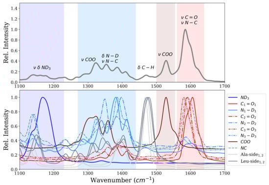 Figure 3 shows the infrared spectrum computed from first-principle MD simulations of the ALAL peptide in deuterated water. The amide I region shows one intense band centered at ∼1600 cm, which can be attributed to the carbonyl stretch vibration (), and another one at ∼1528 cm which we assign to the stretch vibration of the carboxyl group (). Also bands in the amide II and amide III region between ∼1250–1440 cm and ∼1100–1250 cm, respectively, are visible. According to the computed power spectrum, these bands correspond to vibrations of the groups and the N-terminal group, respectively. There is also a significant contribution of the carboxyl group to the bands of the amide II region, as can be seen from the power spectrum (Figure 3 bottom panel). The motion of both the Ala and the Leu side chain have a large peak at ∼1470 cm in the power spectrum which, due to the low change in dipole moment of these unpolar groups, translates to only little intensity in the infrared spectrum.