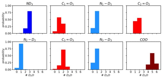 The third and fourth water molecules are at the edge of the “moderately” interacting zone, as also manifested by the probability distribution of number of water molecules in the two zones (see Figure 8b–d), for the first, second, and third time window, respectively). These more distant water molecules, moreover, show only weak interactions with the group in all three time windows. For all four closest water molecules considered in the calculation of interaction energies, the distance of the closest hydrogen atom (among the hydrogen atoms of all four water molecules) to the group, which is also part of the fragment, is large enough (, see Table 1) that one can consider the calculated interaction energies to be dominantly with the group.