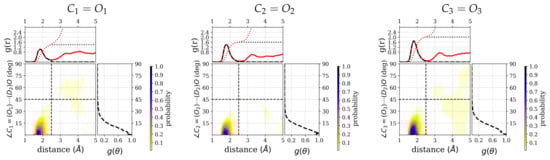 Combined radial distribution functions, , and angular distribution functions, , of hydrogen-bonded water (D-atoms) around the three carbonyl groups of the ALAL peptide. For the other groups, see Supplementary Figure S3. Each top marginal plot shows and right marginal plot shows for the respective distribution function. A black dashed line is used to show the restriction according to the hydrogen bond criteria. In each plot, the black and red dotted curves represent the running integration of hydrogen-bondedwater molecules and of all water molecules, respectively.