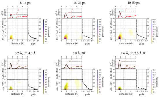 Radial distribution functions, , and angular distribution functions, , of hydrogen-bonded water (D-atoms) around the group of the ALAL peptide, computed for three different time windows: 8–16 ps, 16–36 ps, and 40–50 ps and from constrained simulations (see methods for details). Each top marginal plot shows and right marginal plot shows for the respective distribution function. A black dashed line is used for to show the restriction to hydrogen bond criteria. In each plot, the black and red dotted curves represent the running integration of hydrogen-bonded water molecules and of all water molecules, respectively.
