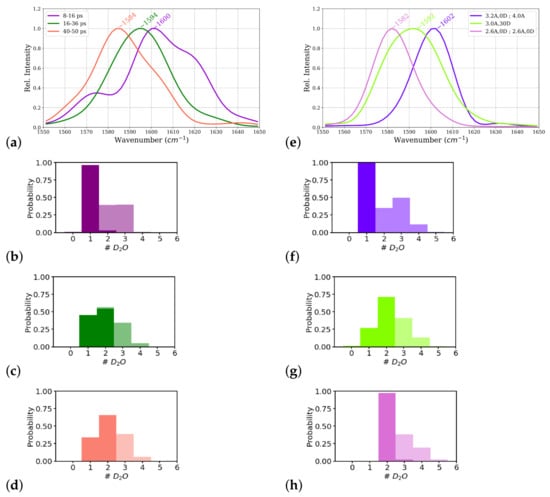 Peptides are often used as small, tractable model systems for proteins in order to study their conformational dynamics and the dynamics of the surrounding water molecules, which play a key role in protein function [1]. Typically, protein or peptide dynamics take place over longer timescales, whereas the timescales of water dynamics are around picoseconds, mainly due to high mobility of water molecules and frequent changes in the hydrogen bonding state [2,3,4]. To probe the conformational state of a peptide, infrared (IR) spectroscopy of the so-called amide region is employed. The vibrational fingerprints of this region are due to the motions of the groups involved in the peptide bond, that is, carbonyl, , and group stretching and bending motions. Depending on the backbone conformation of a peptide, e.g., a fully formed -helix or a -sheet, the characteristic frequencies of the bands in this region differ, in principle, allowing an assignment of the observed conformations. For larger and flexible peptides, there are, however, many possible conformations conceivable, and it is not a priori clear which one dominates and whether and how these interchange. While time-resolved IR spectroscopy techniques provide a time resolution that allows us to measure structural dynamics of proteins and peptides in a solvated environment on picoseconds timescales [5], the assignment of the timescales to the underlying processes, and even more simply, the probable conformations, call for an accompanying approach.