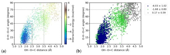The interaction energies between the fragment containing the group and individual water molecules vary between almost nothing for the more distant water molecules and ∼6 kcal/mol, which is about the upper limit for the strength of hydrogen bonds [65]. Figure 9 shows the distribution of distances and angles to the group of the closest four water molecules and their interaction energies. Within the region that is considered to be hydrogen-bonded, as by hydrogen–acceptor distance and donor–hydrogen–acceptor angle (indicated by dashed lines in Figure 9a), the interaction energies are strongest. Note, however, that toward shorter distances, i.e., at ∼1.6 Å and below, the interaction energies are less favorable. With larger distances and angles, the interaction energy strength generally decreases. One can, however, group these “outer” region also in different zones, based on the (average) interaction energies observed there. Doing this by k-means clustering with three clusters, a “strongly interacting zone” can be recognized that coincides with the hydrogen-bonded region (indicated by dashed lines in Figure 9b), a “moderately interacting zone” at larger distances and angles, but below Å and 75 (indicated by dotted lines in Figure 9b), and a “weakly interacting zone” (at even larger distances and angles) can be distinguished. The classification into “strong”, “moderate” and “weak” is based on the average interaction energies within the clusters (see Figure 9b). Note that there are also water molecules that geometrically qualify as “strongly hydrogen-bonded” but are members of the “moderately interacting” cluster. Grouping the data into two clusters mainly results in hydrogen-bonded and not hydrogen-bonded water molecules whereas a grouping into four cluster partitions the hydrogen-bonded zone into two groups of “strong” and “very strong” interactions and a separation into “moderately” and “weakly” interacting (see Figure S6), comparable to the results for three clusters. In order to use geometric criteria for a qualitative description of interaction strengths, we decided to use three clusters, i.e., hydrogen-bonded corresponds to “strong”, other close water molecules are classified as “moderately” interacting, and the remaining water molecules are considered as weakly or noninteracting.