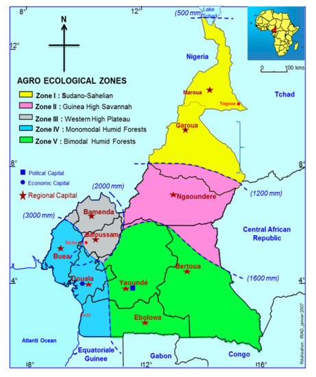 - Aboubakar, N.; Havard, M.; Njoupouo, A.; Nansé, M.; Kajeu, S. Rapport Annuel 2007: Rayonnement de L’IRAD et Élaboration Participative D’une Nouvelle Stratégie de la Recherche Agricole; Institut de Recherche Agricole pour le Développement: Yaoundé, Cameroun, 2009. [Google Scholar]