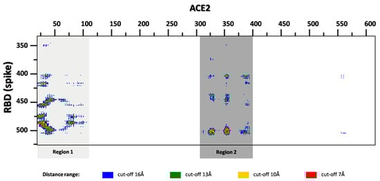 The distance range map of the inter-molecular contacts between the SARS-CoV-2 spike receptor-binding domain and human ACE2 (prepared by COCOMAPS server). Two regions in close contact have been highlighted by gray rectangles.