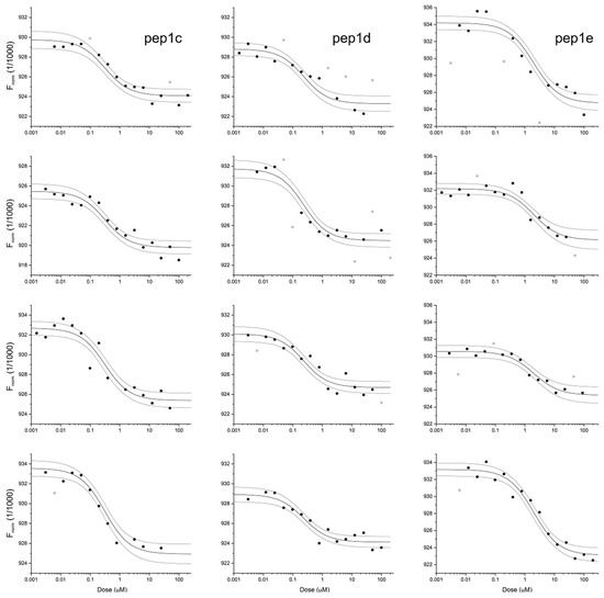 Interaction of RBD domain of SARS-CoV-2 protein with pep1c (left), pep1d (center) and pep1e (right), monitored with MST pseudo-titration experiments. Thick lines represent the model fitted for each peptide globally, using data from four independent experiments, while thin lines denote the 95% confidence bands for the fitted line. Gray circles identify data excluded from the analysis.
