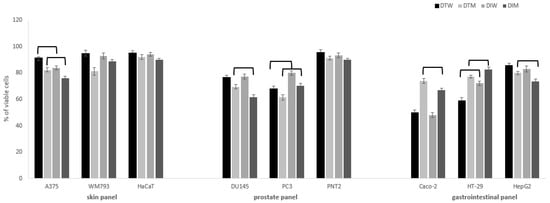 Cytotoxic activity of dragon fruits from Israel (DI) and Thailand (DT) on normal and cancer cells in skin, prostate and gastrointestinal panel. Cells were incubated with fruit water (W) or methanol (M) extracts (0.5 mg/mL). Cell viability was expressed as % of control (untreated) cells (n = 3). Values that are significantly different are combined with upper black line (p < 0.05).