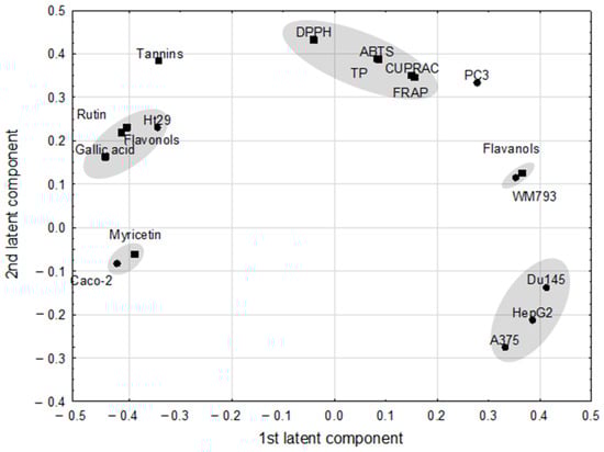 The PLS model, which fulfilled cross-validation criteria, showed the correlation structure between the set of predictive parameters with the response ones (Figure 2). The model, with two significant components, explained 96.8% of variance in the predictive parameters and 92.3% of variance in the response parameters, with eigenvalues of 1.89 and 1.98 for the first and second component, respectively. Correlation weights obtained from the PLS model are presented in Table 3. Eleven predictive parameters (ABTS, DPPH, CUPRAC, flavanols, flavonoids, FRAP, gallic acid, myricetin, rutin, tannins, and TP) and seven response parameters (A375, Caco-2, DU145, HepG2, HT-29, PC3, WM793) were included in the PLS model, whereas others were excluded as they were considered non-informative (Figure 2). The first latent component in this model had negative weights predominantly for the gallic acid, flavonoids, rutin and HT-29 (creating an apparent cluster of mutually correlated parameters), as well as for Caco-2 and myricetin (second cluster of parameters), whereas it had high positive weights for response parameters: DU145, HepG2, and A375, and also for WM793 associated with flavanols.