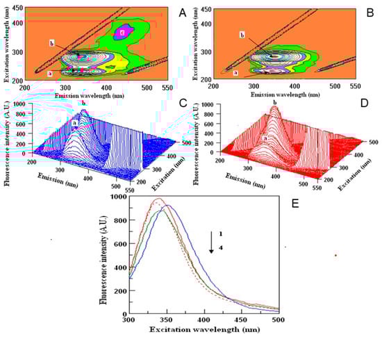 Counter maps (A,B) and their three-dimensional fluorescence (3D-FL) spectra (C,D) of interaction of human serum albumin (HSA) with polyphenols water extracts of Thai (A,C) and Israeli (B,D) dragon fruits; two-dimensional (2D-FL) fluorescence intensities (FI) from the top (E): 1, HSA in buffer; 2, HSA + water; 3, HSA + water extract of Thai; and 4, HSA + water extract of Israeli dragon fruits with λ em (nm) of 340, 336, 352 and 340; FI of 983.18; 945.87; 927.13 and 876.65 arbitral units.