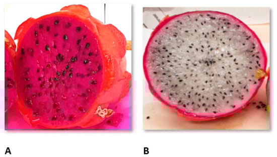 The example of evaluated dragon fruits: (A): H. costaricensis, with red skin and red flesh harvested in Israel and (B): H. undatus, with red skin and white flesh harvested in Thailand.