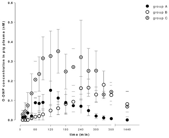 For the study of organ distribution in group C, the pigs were exsanguinated in the morning on day 9 and immediate autopsy was performed. The blood and selected organs (heart, lung, muscle, fat, spleen, liver, kidney, gastric and intestinal wall, selected parts of the brain) were extracted and homogenized. For the elimination study, urine directly from the bladder and bile from the gallbladder were removed. Concentrations of donepezil and its primary active metabolite 6-O-donepezil were determined via high-performance liquid chromatography coupled with mass spectrometry in both plasma and organ homogenates.