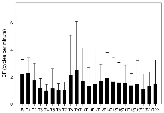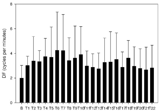 In group C, DF increased from basal values significantly after 105 min. Higher DF was then sustained for the following 165 min, as shown in Table 3 and Figure 10. Power and power ratio had a corresponding pattern (Table 4, Figure 11, Figure 12, Figure 13, Figure 14, Figure 15 and Figure 16).