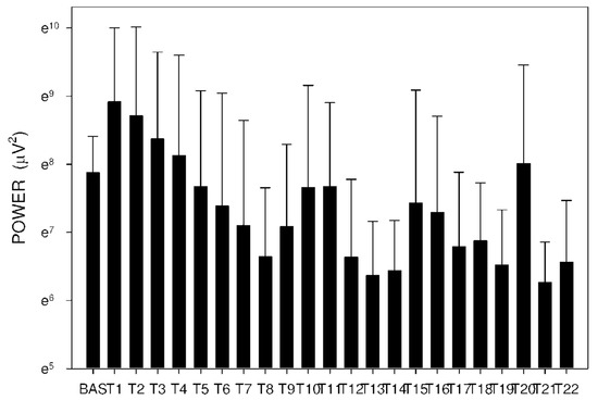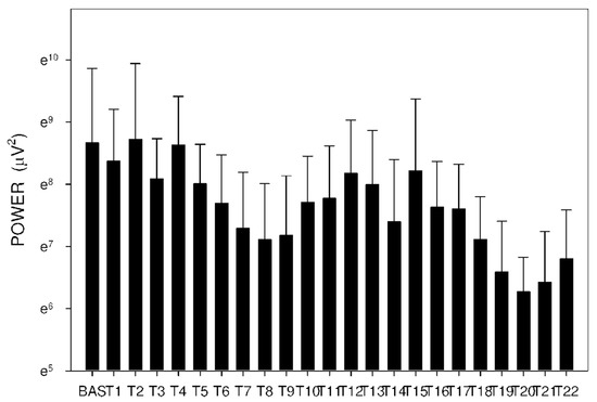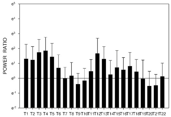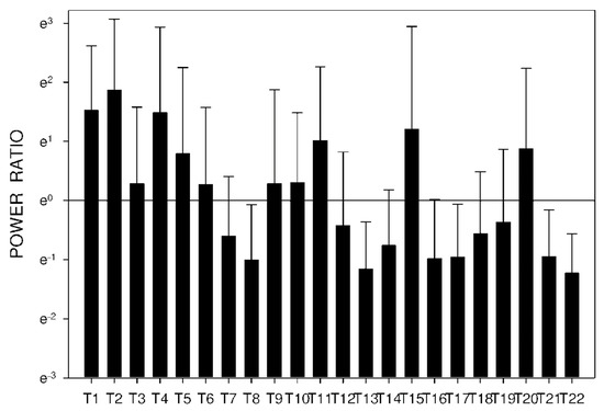 In group A, the power ratio decreased from its highest values thirty minutes after the drug administration to low levels after an interval of 120 min. Group B showed a similar profile, as shown in Figure 14 and Figure 15. In group C, the power ratio dropped significantly from higher values 30 min from the start to low levels after 120 min. The power ratio rose again after the following 60 min, terminating with decreased values after 315 min, as shown in Figure 16.
