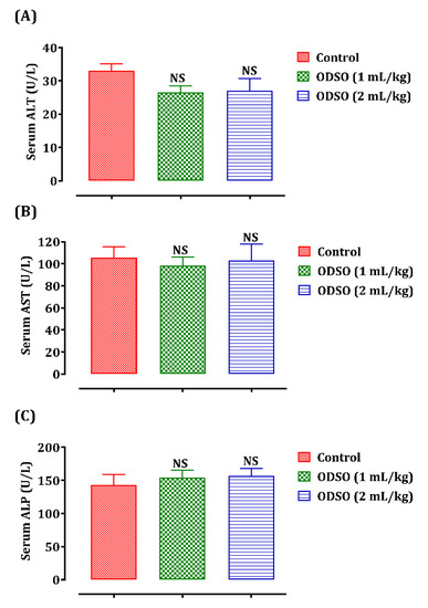 The daily ODSO administration effect during four weeks of treatment on liver function is shown in Figure 1. Daily administration of ODSO at a dose of 1 and 2 mL/kg during the 30 days did not cause any significant variation in the level of hepatic biomarkers, which are the hepatic transaminases alanine aminotransferase (ALT) (A), aspartate aminotransferase (AST) (B), and alkaline phosphatase (ALP) (C) in comparison with the control group.
