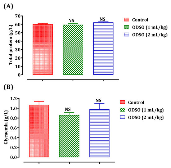 Blood glucose and total plasma protein levels were also quantified to demonstrate the safety of ODSO in the long term (Figure 4). The daily gavage of rats with ODSO (1 and 2 mL/kg) for four weeks did not induce any significant variation in these two plasma parameters—total proteins (A) and blood sugar (B)—in comparison with the control group.