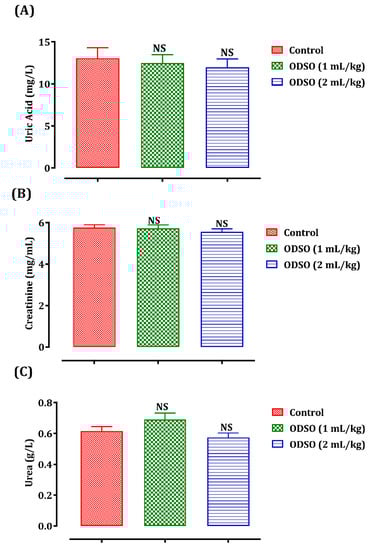 The biomarkers of renal function in the rats were explored after one month of ODSO administration (Figure 5). Daily administration of ODSO by normal rats and at doses of 1 and 2 mL/kg for 30 days did not influence the uric acid (A), creatinine (B), and uric acid levels (C) compared always to the control group.