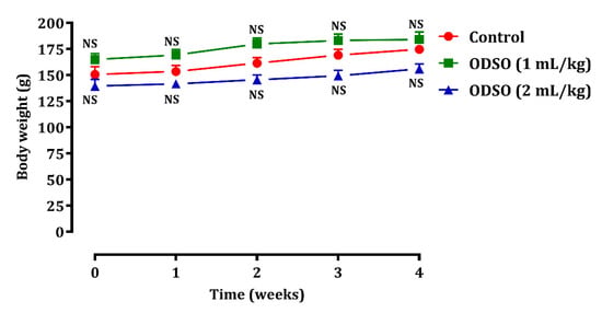 The safety of ODSO was also assessed by the change in body weight (Figure 6) during the four weeks of consumption of ODSO (1 and 2 mL/kg) in normal rats. The results showed that the change in body weight in the rats treated with ODSO was similar to that in the control group.