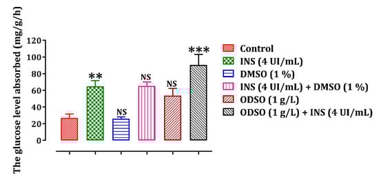 The incubation of the isolated rat hemidiaphragm in Tyrode’s solution and the presence of ODSO at a concentration of 1 g/L stimulated the uptake of glucose by the isolated rat hemidiaphragm (53.51 ± 8.84 mg/g/h) in comparison with the control group (26.64 ± 4.96 mg/g/h). Moreover, the incubation of the hemidiaphragm in the presence of ODSO (1 g/L) and insulin (4 IU/mL) significantly (p < 0.001) increased glucose absorption (90.50 ± 12.59 mg/g/h), compared to the incubated isolated rat hemidiaphragm, only in the presence of ODSO (Figure 8).