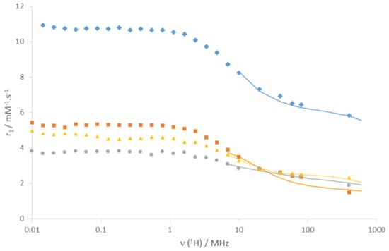 1H Nuclear Magnetic Relaxation Dispersion (NMRD) profiles of GdL1 (◆), GdL2 (■), GdL3 (●) and GdL4 (▲) at 37 °C. The lines represent the best fit to the SBM equations.