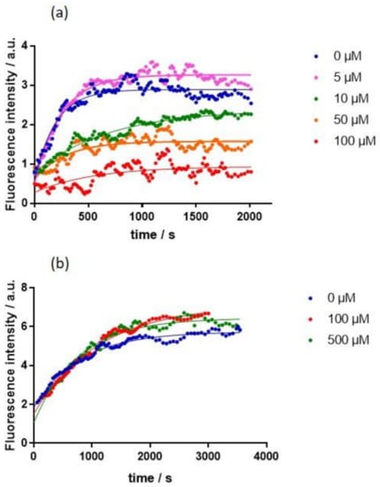In a similar way, no enzymatic conversion could be observed for 24 h by relaxivity measurements in a GdL4 (0.94 mM) solution in the presence of 6.69 × 10−3 U of caspase-3 (corresponding to ~60 nM), 50 mM HEPES buffer (pH 7.4), 0.1 M NaCl and 10 mM DTT (1,4-dithiothreitol) as the reducing agent, at 37 °C. In this case, the fluorescent competition assay showed practically no impact of up to 700 equivalents of GdL4 on the enzymatic transformation of the dye N-acetyl-DEVD-AFC (AFC = 7-amido-4-trifluoromethylcoumarine; Figure 3). Again, the combined relaxivity (GdL4) and luminescence (EuL4) data suggest potential coordination of one carboxylate group of the peptide side chain to the metal ion. This hypothesis seems to be supported also by the fact that the DEVD substrate is not recognized by the enzyme.