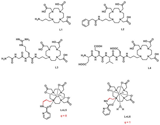 Structure of the ligands L1, L2, L3 and L4, and coordination modes for the LnL5 and LnL6 complexes [] discussed in the text.
