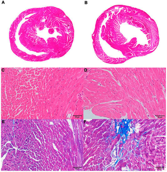 Hematoxylin-eosin (H&E) staining of the myocardium revealed that the ventricles of mice in the ACM group were slightly dilated (Figure 1A,B), the cardiomyocytes showed slight hypertrophy, and the arrangement was locally disordered (Figure 1C,D) compared with the control group. Masson’s trichrome staining demonstrated a small number of collagen fibers around the vessels and myocardial interstitium in the myocardial tissue of mice in the ACM group, but these changes were not observed in the control group (Figure 1E,F). Sirius red staining revealed similar results with Masson’s trichrome staining (Figure S2).
