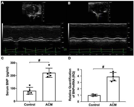 Assessment of cardiac function. (A) Echocardiography analysis of the control group; (B) echocardiography analysis of the ACM group; (C) biochemical analysis of serum brain natriuretic peptide (BNP) level; (D) analysis of myocardial BNP mRNA expression. # p < 0.01.