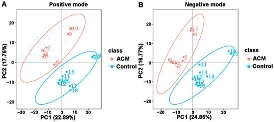 Principal components analysis (PCA) between the control and ACM groups. (A) Positive mode; (B) negative mode.