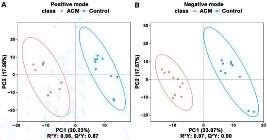 The PCA and PLS-DA plots demonstrated satisfactory separation between the ACM and control groups (Figure 3 and Figure 4). Permutation tests of both positive and negative modes revealed that all Q2 values to the left were lower than the original points to the right, and the regression line of the Q2 points intersected the vertical axis below zero, which indicated no overfitting and good reliability of the PLS-DA models according to the validity criteria (Figure S5).
