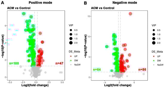 Volcano plots of myocardial metabolomics data between the control and ACM groups. (A) Positive mode; (B) negative mode. Red represents upregulated metabolites, green represents downregulated metabolites, and gray represents metabolites with no difference between the two groups. The variable importance in projection (VIP) values represent the most important metabolites obtained in the PLS-DA model.