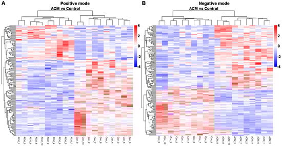 Heatmaps of differentially expressed metabolites between the control and ACM groups. (A) Positive mode; (B) negative mode.