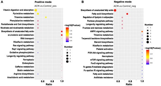 The top 20 KEGG pathways related to differentially expressed metabolites between the control and ACM groups. (A) Positive mode; (B) negative mode.