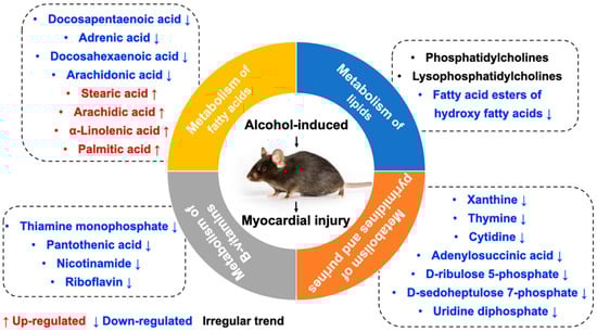 Numerous studies have demonstrated that chronic alcohol consumption leads to B vitamin deficiency [,]. Compared with the control group, the myocardial tissue of mice in the ACM group exhibited decreased levels of several B vitamins, including thiamine (vitamin B1), riboflavin (vitamin B2), pantothenic acid (vitamin B5), and nicotinamide (the metabolite of niacin, vitamin B3). Among all B vitamins, thiamine deficiency is most associated with cardiovascular disease and cardiac dysfunction in patients with ACM []. Thiamine plays important roles in energy metabolism, antioxidation, and improvement of endothelial function, and thiamine deficiency can cause various diseases and dysfunctions, including heart failure [,]. Increased levels of metabolites related to oxidative phosphorylation were also observed in the ACM group, including nicotinamide adenine dinucleotide (NAD) and NAD+, which might be related to the downregulated levels of thiamine. Additionally, chronic alcohol consumption can also lead to riboflavin deficiency, which is also associated with heart failure [,]. Therefore, we speculate that extensive downregulation of B vitamins in the ACM group might be one of the potential mechanisms of ACM.