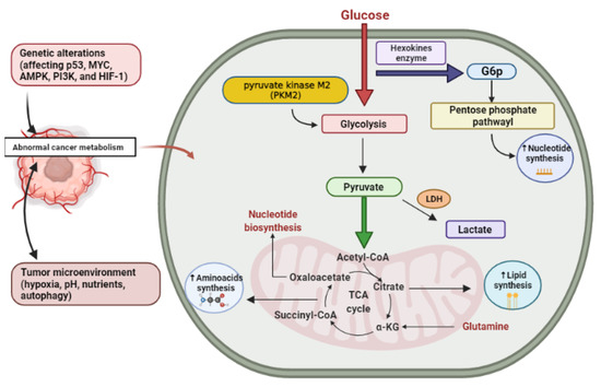 Generally, cancer cells have the ability to proliferate from one abnormal cell to more than 109 cells (the total number of cells ~1 cm in diameter in a tumor) if suitable conditions are available [20]. Tumor cells will modify their metabolism to guarantee survival, overpower host immune attack, and maintain the proliferative capacity to induce their lethal effects and sustain survival [21]. Cancer cells undergo physiological adaptations to preserve their survival under many stressful conditions, such as hypoxia and food hunger in order to fulfill their massive growth requirements. Such metabolic modifications generate abnormal metabolic events when compared to normal cells. This reprogrammed metabolism is seen as a cancer signature, as many metabolic modifications are predominant in several other types of cancers [22]. Similar to normal cells, cancer cells also have to produce ATP to maintain both daughter cells formed through division, rely on metabolic intermediates or biosynthesis by-products and, most critically, to compete with the oxidizing effects to mitigate the impact of reactive oxygen species (ROS). These altered metabolic and bioenergetic mechanisms, significantly elevated biosynthesis and redox equilibrium, are crucial to cancer progression [23]. Therefore, proliferating cells need to obtain high amounts of lipids, nucleotides, and amino acids. Through using by-products and derivatives of the TCA (tricarboxylic acid) cycle, cells can generate this biomass [24]. It would appear that fulfilling all these requirements would require a significant boost in glucose uptake in tumors. The high glucose consumption in many, but not all, tumors have been verified by PET (positron emission tomography) imaging and glucose consumption rates beyond the levels that can be easily explained by energy or metabolite requirements [25]. Moreover, the utilization of glutamine meets a symmetrical pattern of excessive consumption [26]. It is believed that cancer metabolism could be described as upregulation of the metabolism of both glucose and glutamine for the production of energy.