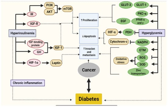 One of the notable characteristics of cancer cells is the increased uptake of glucose and enhanced glucose metabolism [82] to be able to grow and divide rapidly. Cancer cells possess altered metabolism via aerobic glycolysis, namely the “Warburg effect” [29]. Hyperglycemia promotes tumor growth via proliferation, anti-apoptosis, and metastatic activity [83]. The proliferative effect induced by hyperglycemia occurs as a result of overexpression of the following: glucose receptors (GLUT-1, GLUT-3) in tumor cells, protein kinase C (PKC-α), peroxisome proliferator-activated receptor (PPAR α and γ), and epithelial growth factor (EGF) [83]. On the other hand, the anti-apoptotic activity of hyperglycemia is a consequence of the decreased level of prolyl hydroxylase (PDH) enzymes that eliminate the hypoxia-inducible factor α (HIF-α), thus leading to elevated HIF-α, which is a vital regulator of tumor cell survival in a hypoxic and anabolic environment. Additionally, hyperglycemia preserves cytochrome-c mediated apoptosis by elevated nicotinamide adenine dinucleotide phosphate (NADPH). Hyperglycemia also promotes metastasis and invasiveness due to several factors including epithelial to mesenchymal transition (ETM) process, oxidative stress via reduction of reactive oxygen species (ROS) and increased superoxide dismutase (SOD), and elevated expression of zinc transporters leading to enhanced zinc absorption which is involved in migration of cancer cells [84]. Moreover, oxidative stress is a possible risk factor for carcinogenesis in diabetic people since it is the initial mechanism of insulin resistance; which is due to the inactivation of insulin receptors resulting from the overproduction of superoxide in the mitochondria [72].