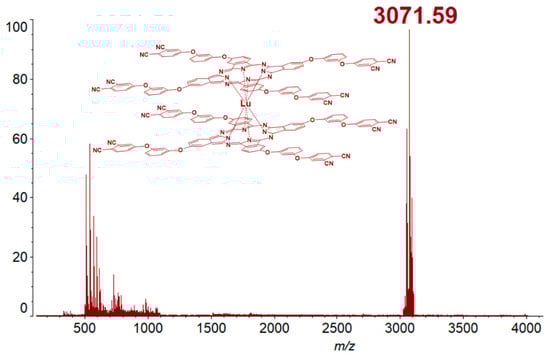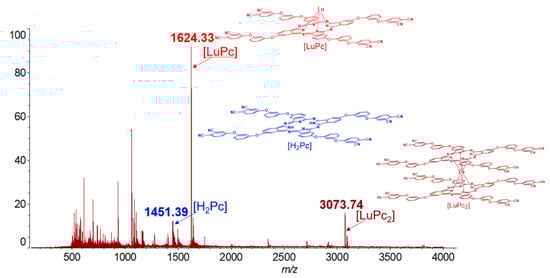 Compounds 3–5 were identified using IR, NMR spectroscopy, MALDI-TOF mass spectrometry data. The mass-spectrum of the compound after the two-step purification no longer contained the signals of the monocomplex and metal-free phthalocyanine, as previously shown (Figures S1 and S2). There is only an intense band corresponding to the target complex (Figure 2). This partly proves successful cleaning of the compound.