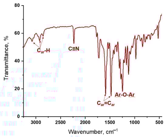 Compound 2 was characterized by IR, NMR spectroscopy and MALDI-TOF spectrometry. In the IR spectrum, all characteristic vibrations inherent in the described structure are observed, such as 3088–2850 cm−1 (Car-H); 2243 cm−1 (C≡N); 1586–1389 cm−1 (Car=Car); 1256 cm−1 (Ar–O–Ar). The degree of completion of the nucleophilic substitution reaction was also monitored using IR spectroscopy. The spectrum of compound 2 after purification does not contain symmetric (1340–1350 cm−1) and asymmetric (1560–1565 cm−1) vibrations of the nitro groups of the initial 4-nitrophthalonitrile (1). Also, the appearance of a band at 1256 cm−1 is observed, which is responsible for the vibrations of the Ar-O-Ar group resulting from the reaction. The high resolution mass spectra represent a signal at m/z 362.11, corresponding to the structure of phthalodinitrile 2. The structure was confirmed by the position, shifts, and signal multiplicity in the 1H- and 13C-NMR spectra.