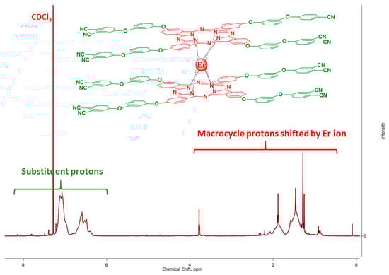 1H-NMR spectra were also recorded for all complexes (Figure 4, Figures S3 and S4). For paramagnetic erbium and ytterbium, a broadening of all manifested signals and shifts of protons of macrocyclic fragments to the region of a strong field were observed under the influence of proximity to a metal atom. An interesting fact is that the signals of the protons of the peripheral substituents were not shifted and appeared in the aromatic region, which is probably due to their relative remoteness from the complexing atom; however, the effect of the paramagnetic metal broadens the described signals as well (Figure 4).