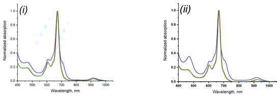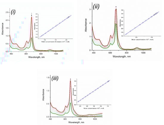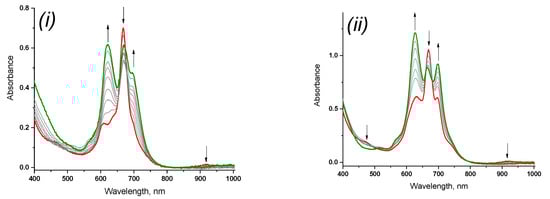 Changes in the UV-vis for 5 (i) at (c = 2.1 × 10−5 mol/L) and 3 (ii) (c = 1.2 × 10−5 mol/L) in a THF solution in the presence of phenylhydrazine 3 × 10−4 mol/L) min (red curve—the initial spectrum, green—the final one).