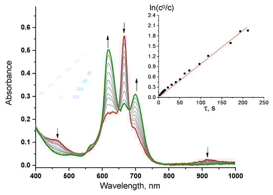 Changes in UV-vis for 4 in a THF solution (c = 1.2 × 10−5 mol/L) in the presence of phenylhydrazine (c = 3.3 × 10−4 mol/L) for 4 min (red curve–the initial spectrum, green–the final one). Insertion: ln(c0/c) versus the reaction time of LuPc2 with phenylhydrazine.