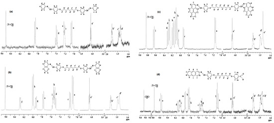 The 1H-NMR spectra confirmed the FTIR results by the appearance of characteristic chemical shifts for the azomethine, aromatic and aliphatic protons, in the right ratio of their integrals (Figure 1a–d). The 1H-NMR spectra of the anthracene-containing dimers could not be recorded due to their poor solubility in deuterated solvents. However, the 1H-NMR spectra of the MAtH8 model compound displayed chemical shifts characteristic to the targeted mono-azomethine, confirming the formation of an azomethine linkage between anthracene and aromatic aldehyde. Moreover, the FTIR spectra of the model compound, except the carbonyl band, was similar to that of the corresponding dimers, confirming once more the right structure of the anthracene-based dimers.