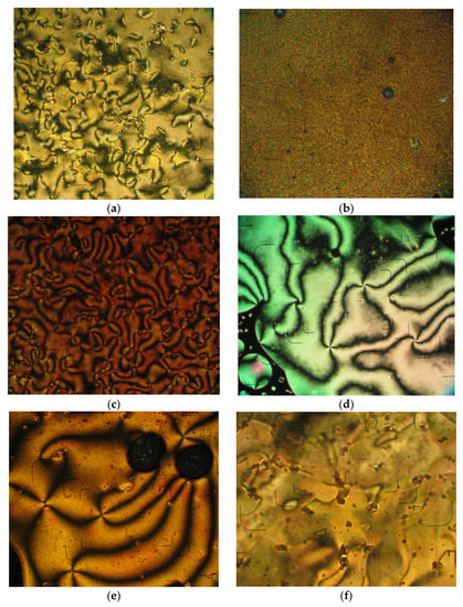 Microphotographs of the azomethine dimers DPyH8 (2C, 157 °C) (a), DPyH9 (1C, 106 °C) (b), DPyH10 (1C, 132 °C) (c), MAtH8 (2C, 242 °C) (d), DAtH8 (1C, 244 °C) (e) and DAtH9 (1C, 250 °C) (f), 1C—first cooling scan, 2C—second cooling scan, in optical light microscopy, crossed polarizers.